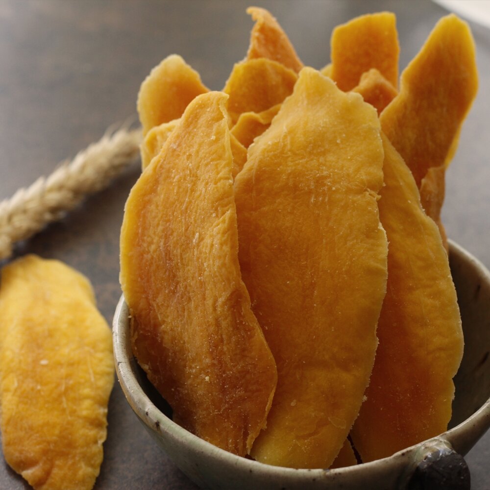 Манго в пакетах в нашем магазине - это слайсы манго, которые на мгновение окунают в воду с тростниковым сахаром и тут же отправляют на вяленье. Это сохраняет их вид, вкус и запах. Это натуральные кусочки манго с минимальным слоем тростникового сахара.