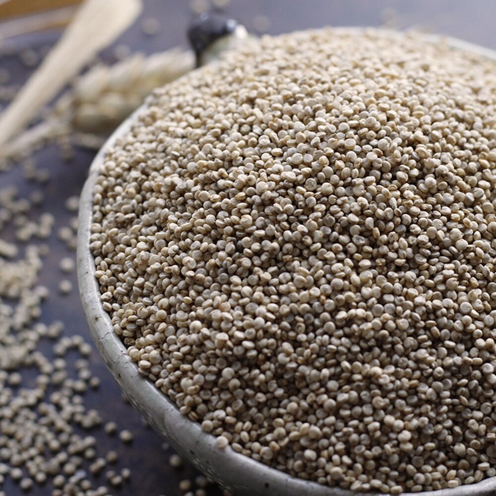 Крупа кіноа білого кольору – найпоширеніший вид, звичний для ока. Головна особливість кіноа – багато заліза та багато білка, за рахунок чого продукт люблять вегетаріанці та прихильники правильного харчування. При цьому кіноа легко замінює молоко та молочні продукти, оскільки має харчову схожість. Це дозволяє включати його в складні дієти для людей із серйозними захворюваннями (діабет, подагра тощо).